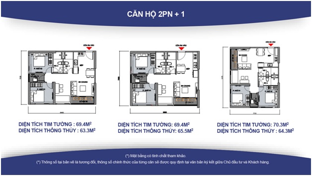 Căn 2 ngủ +1 (2WC): 63 – 65m2, giá bán 2,4 – 2,7 tỷ.