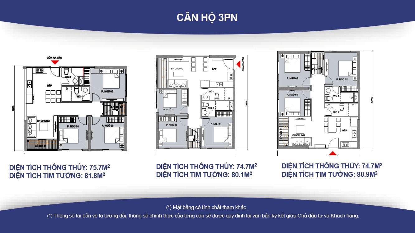 Căn 3 ngủ nhỏ: 73 – 75m2, giá bán 2,8 – 3,1 tỷ.