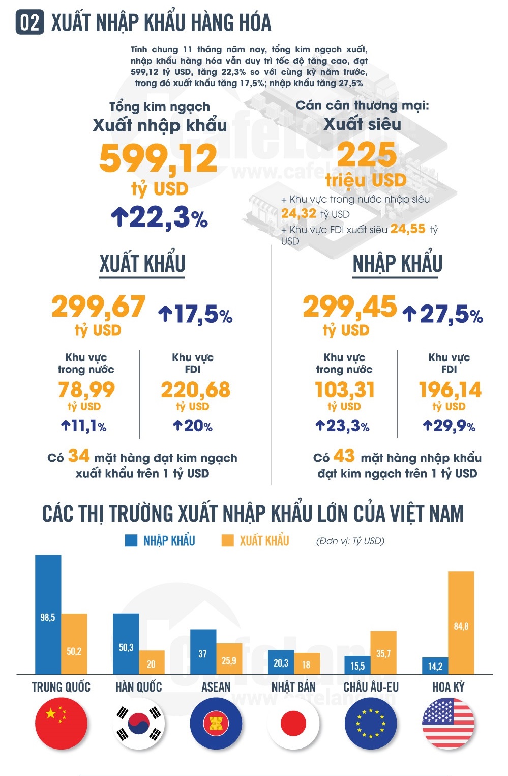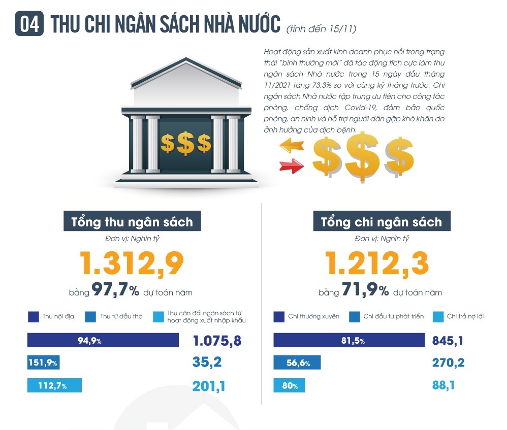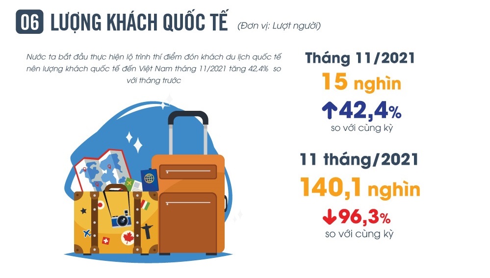 Theo số liệu của Tổng cục Thống kê, bức tranh kinh tế Việt Nam 11 tháng 2021 có nhiều điểm khởi sắc. Tình hình xuất nhập khẩu vẫn duy trì được tốc độ cao với cán cân thương mại đã xuất siêu trở lại; thu hút dòng vốn FDI cũng tăng trở lại; tình hình đăng ký doanh nghiệp đang trên đà phục hồi,...
