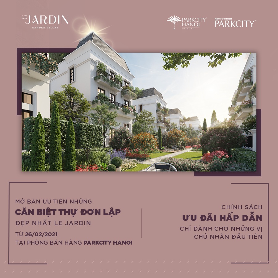 Sau thành công ấn tượng của Nadyne Gardens; Evelyne Gardens và The Mansions, khu biệt thự đơn lập Le Jardin tiếp nối thu hút mọi ánh nhìn của giới thượng lưu với định vị sống sang trọng, thanh lịch, gần gũi thiên nhiên nhưng vẫn bảo toàn những tiêu chuẩn truyền thống.Không chỉ được thừa hưởng hệ thống tiện ích đỉnh cao bên trong ParkCity Hanoi, Le Jardin còn là một quần thể biệt lập, riêng tư, duy trì 5 giá trị cốt lõi đã làm nên một ParkCity Hanoi hoàn hảo : Gia đình, Láng giềng, Cộng đồng, Sự Kết nối và Sự Tiện nghi.